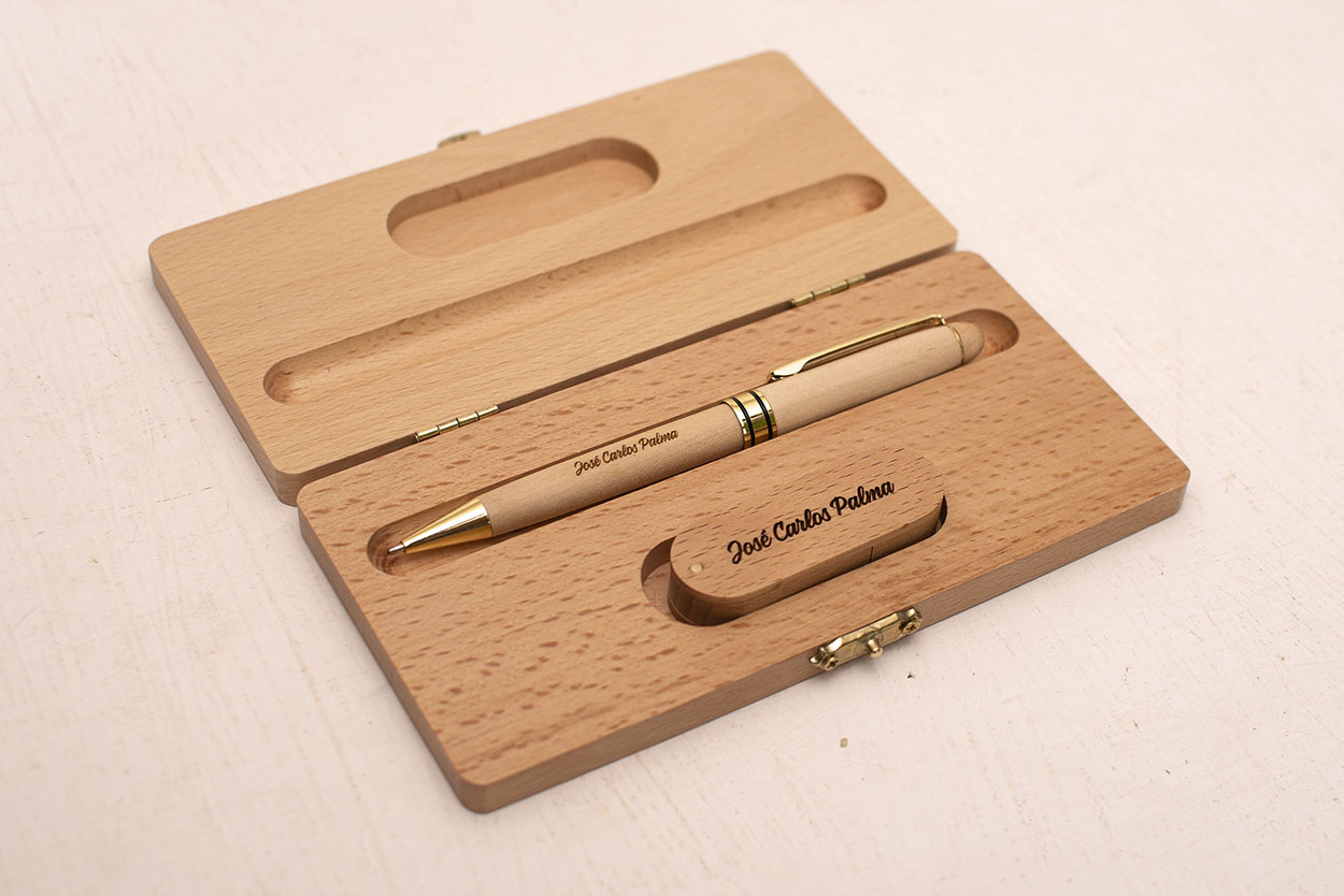 Pluma Boligrafo De Madera + Usb + Estuche Personalizados