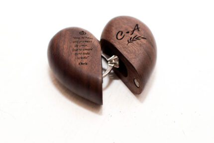 Cajita Anillo de compromiso en forma de corazon -100% madera de nogal -Imanes magneticos -Grabado personalizado