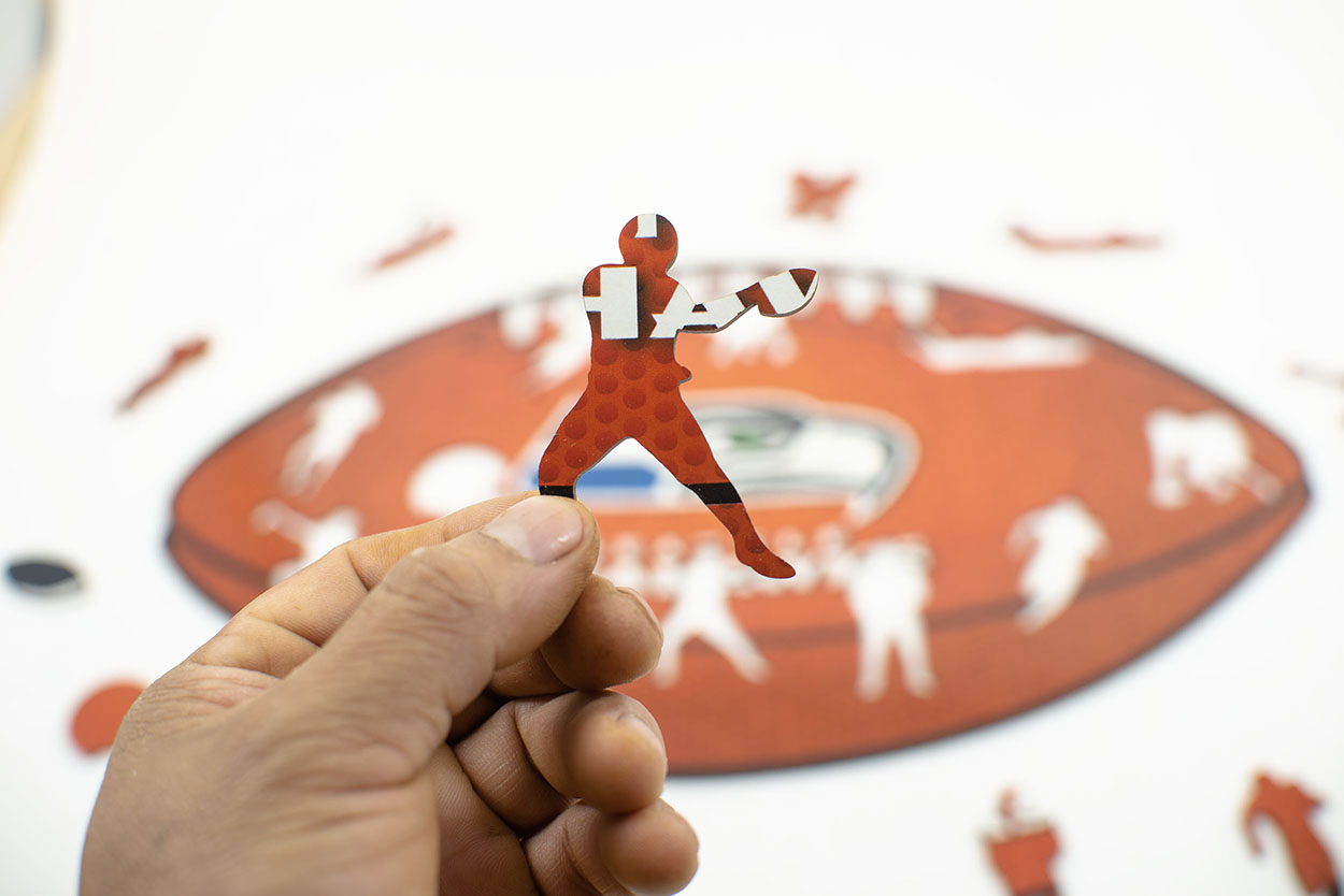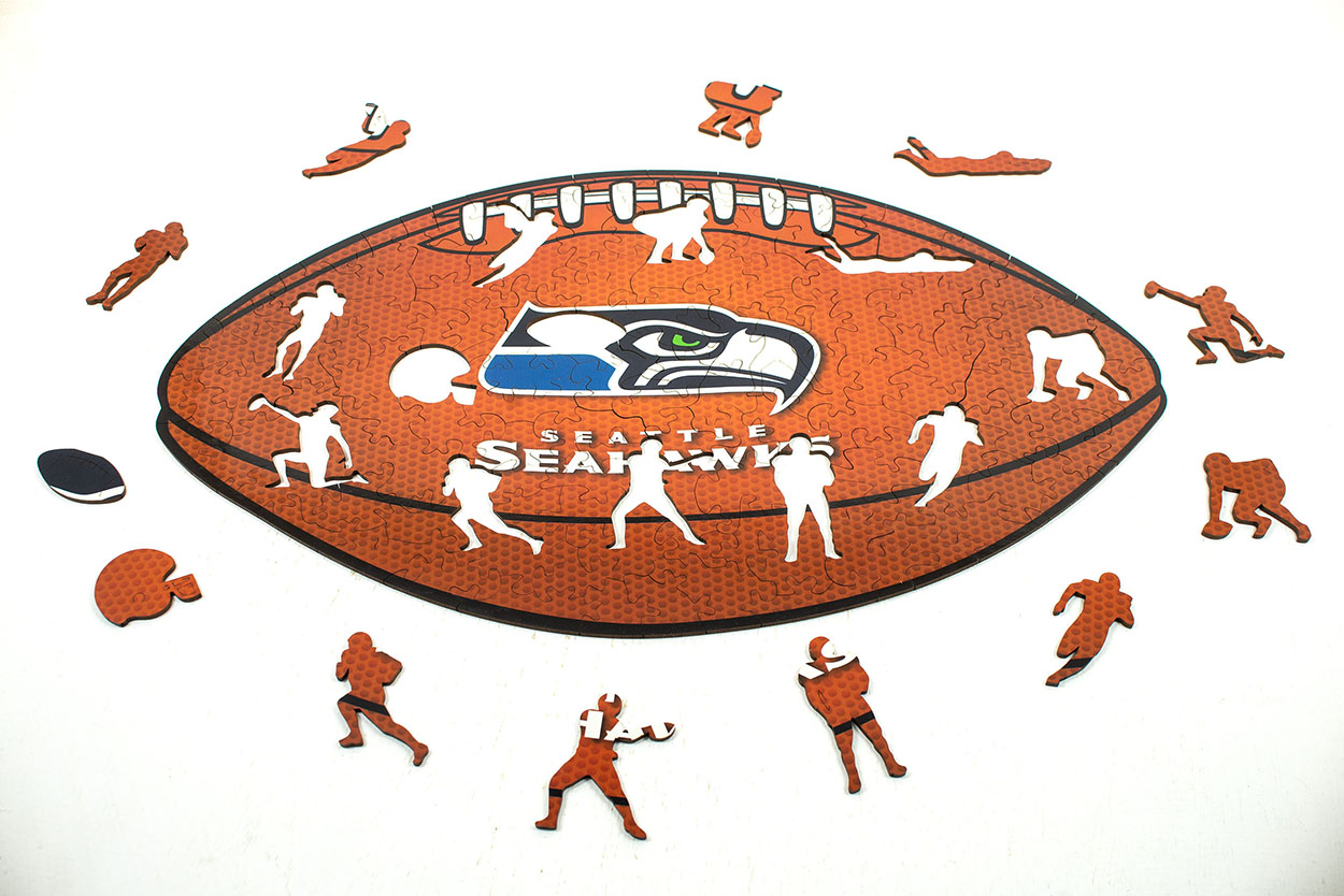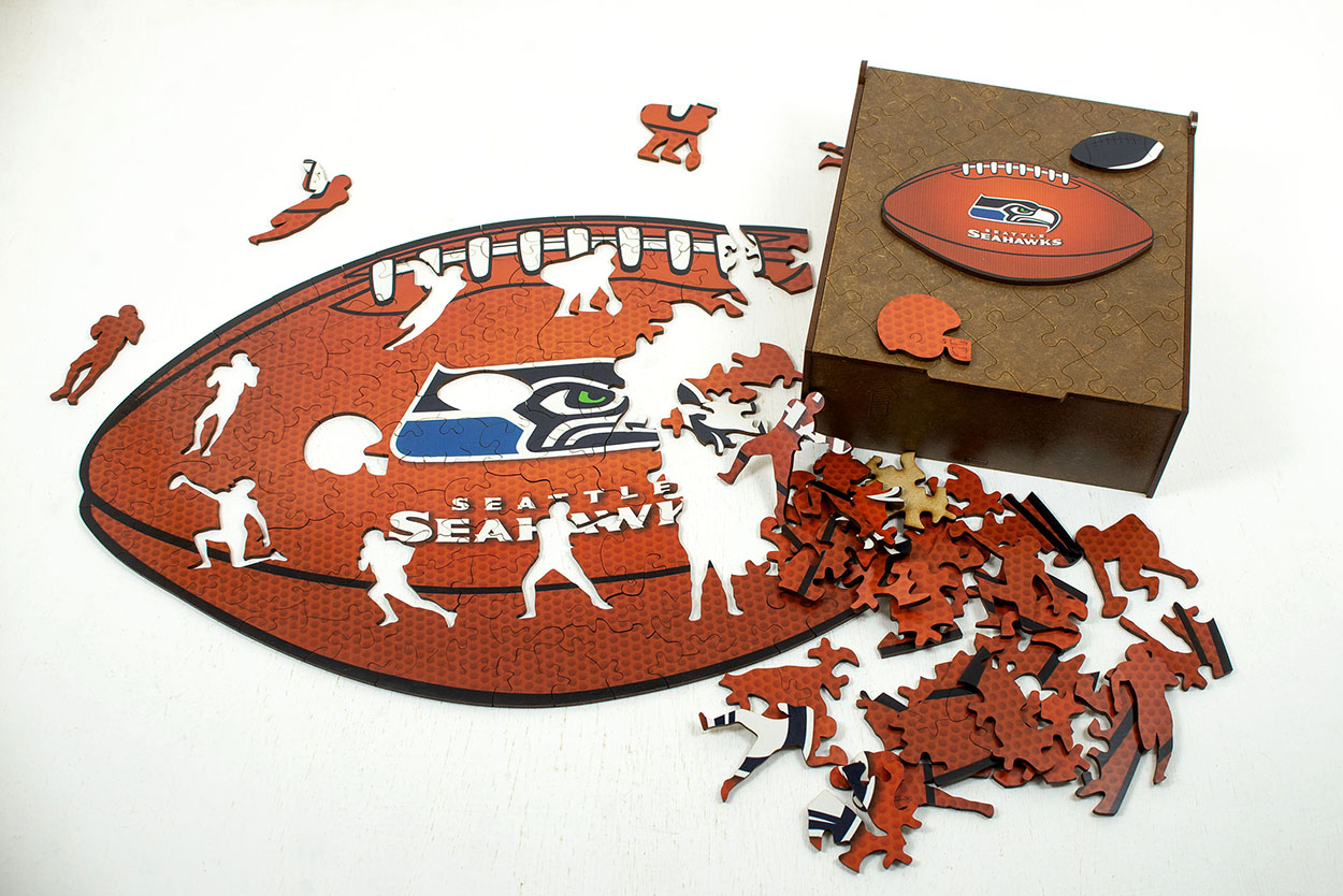 Vive la emoción del futbol americano con este exclusivo rompecabezas de madera inspirado en los Seattle Seahawks, uno de los equipos más emblemáticos de la NFL. Sus piezas están diseñadas con formas y figuras alusivas al mundo del futbol americano: cascos, balones, símbolos del equipo y detalles que evocan la energía de la liga.
